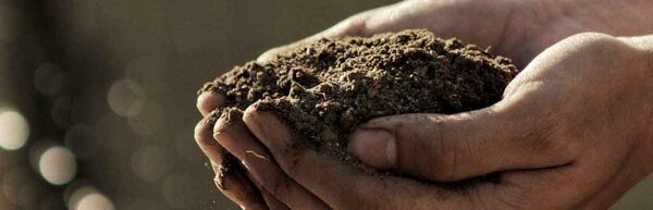 Mikono ya mtu mzima ikishika mchanga wenye miche midogo